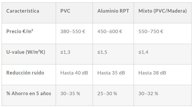 Apuesta siempre por ventanas con rotura de puente térmico (RPT) y vidrios bajo emisivos. Reducirás notablemente el consumo en calefacción y aire acondicionado.
